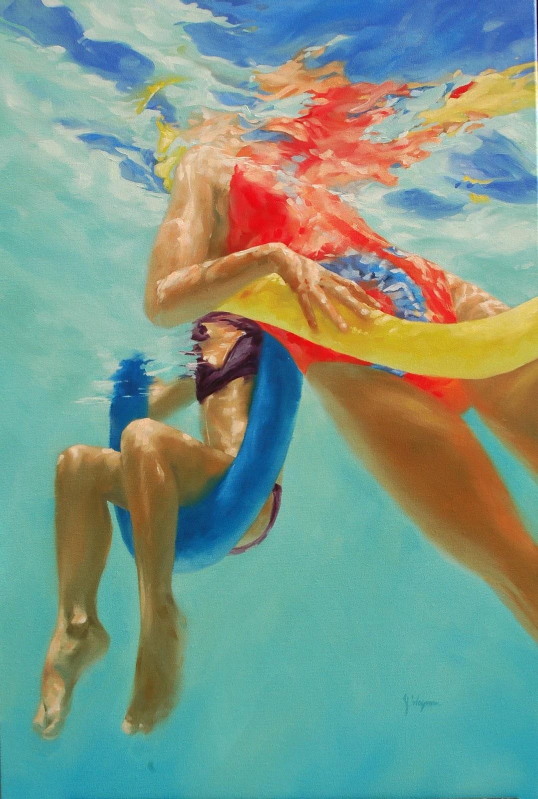 I am gearing up to start some large oil paintings. This painting sold a few years ago, but I have never posted it. My lovely nieces are all in college (almost) now. They were so sweet and adorable playing in the pool with me that day.